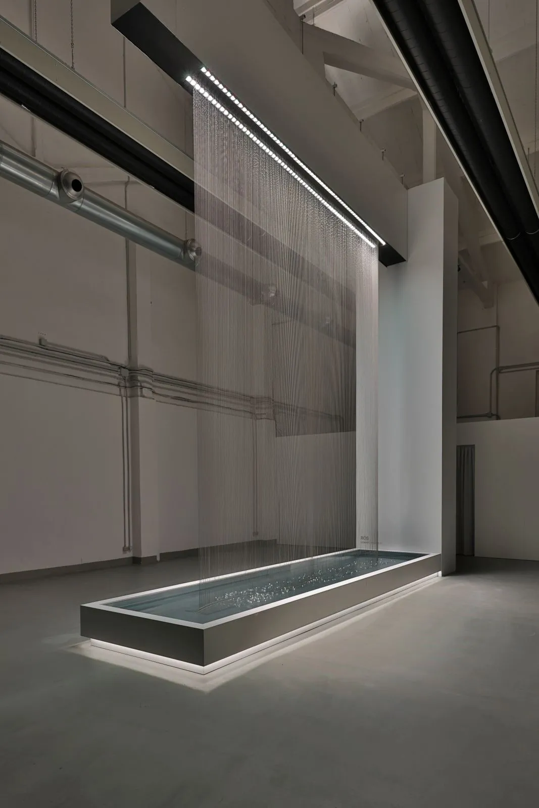 L’installazione ROS nell’Experience Center di Geberit, grande 800 mq, è un’esperienza immersiva e relazionale. Creata dallo studio svizzero atelier oï, interpreta il flusso dell’acqua come sintesi tra estetica e funzione, trasformando il know-how dell’azienda in una narrazione visiva di grande effetto. Centinaia di sottili molle in acciaio inossidabile guidano il movimento delle gocce d’acqua lungo traiettorie definite in una composizione dinamica. Il loro movimento è a volte veloce, a volte lento, si arresta, si unisce o si divide. Foto: ByAlejandroRamire. https://www.geberit.it – Fuorisalone, Geberit Experience Center, Opificio 31, Via Tortona 31, Milano