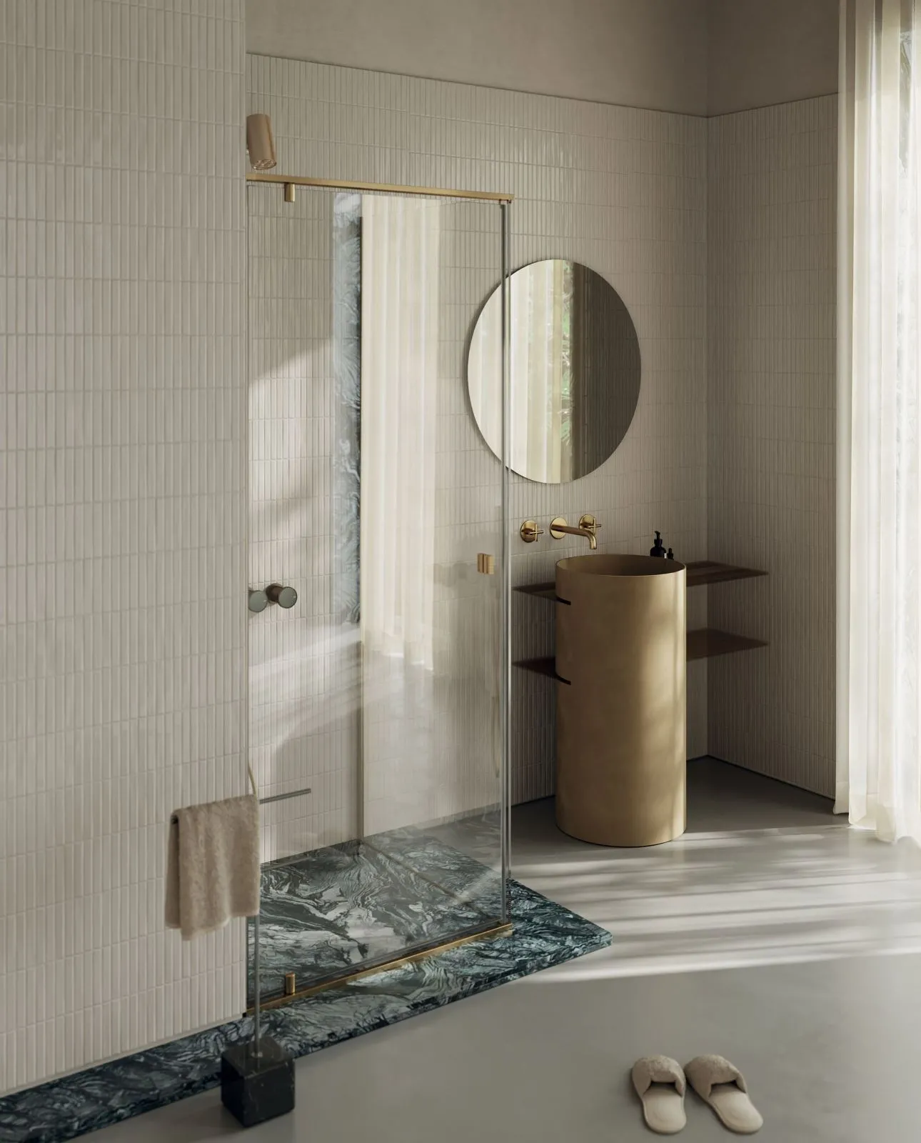 Nell’area doccia e vasca il progetto si sposta verso la dimensione esperienziale. Il bagno diventa ambiente immersivo, dove il benessere non è più solo funzione ma esperienza sensoriale completa.