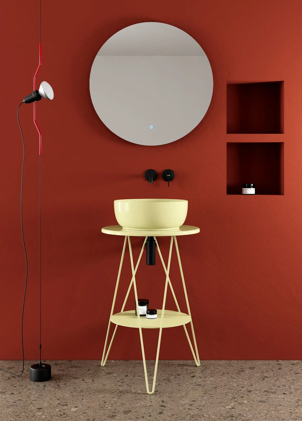 Gustav di Scarabeo è una struttura leggera e ariosa dotata di due piani da appoggio di forma circolare per appoggiare il lavabo e oggetti di uso quotidiano. È realizzato in metallo in svariate colorazioni. Struttura, piani di appoggio e lavabi sono indipendenti nella finitura: possono essere tutti nello stesso colore oppure in colori differenti. Misura Ø 52 x H 76 cm. Prezzo, Iva esclusa, 580 euro. Prezzo, Iva esclusa, del piatto in ceramica per l’appoggio del lavabo nel colore bianco 200 euro, negli altri 11 colori 220 euro. https://www.scarabeosrl.com