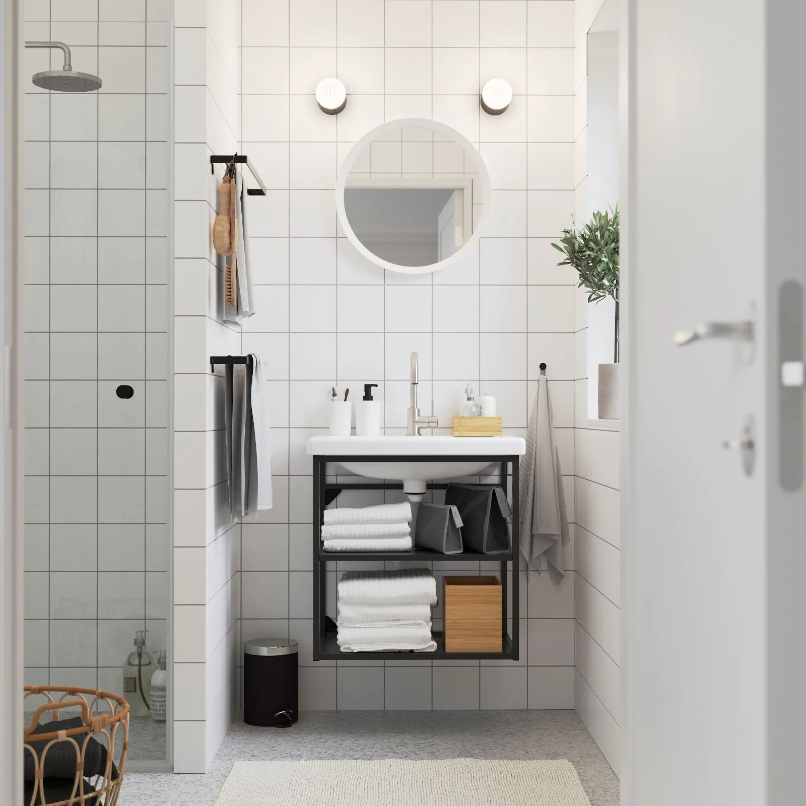 Il mobile lavabo sospeso a giorno ENHET / TVÄLLEN di Ikea ha due ripiani. La struttura a giorno offre un facile accesso ad asciugamani e cesti e crea una maggiore sensazione di spazio. L’acciaio galvanizzato rivestito a polvere resiste a molti anni di uso in ambienti esposti ad acqua, schizzi e umidità. Misura L 64 x P 43 x H 65 cm. Prezzo 179 euro. https://www.ikea.com