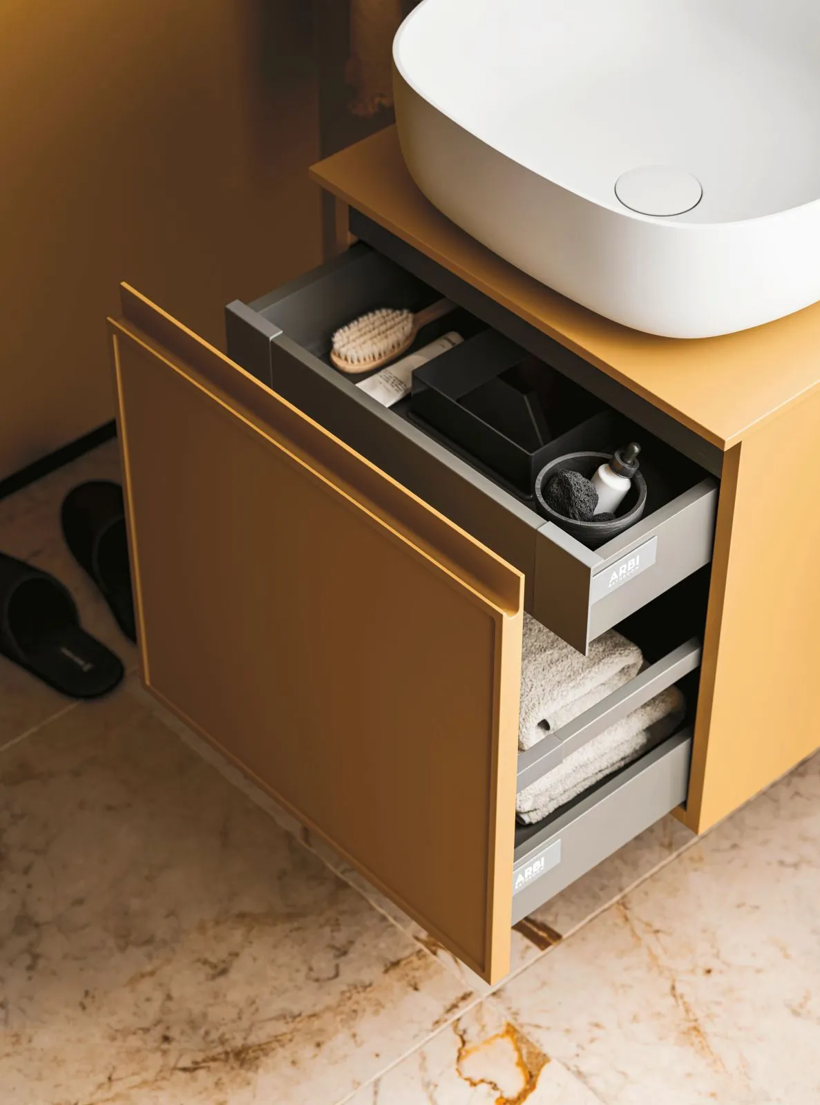 Fa parte della composizione Decor 15 di Arbi Arredobagno il mobile sospeso in laccato Zucca opaco. Il cassetto interno sagomato ottimizza lo spazio contenitivo. Misura L 50 x P 50 x H 49 cm. Prezzo su richiesta. https://www.arbiarredobagno.it