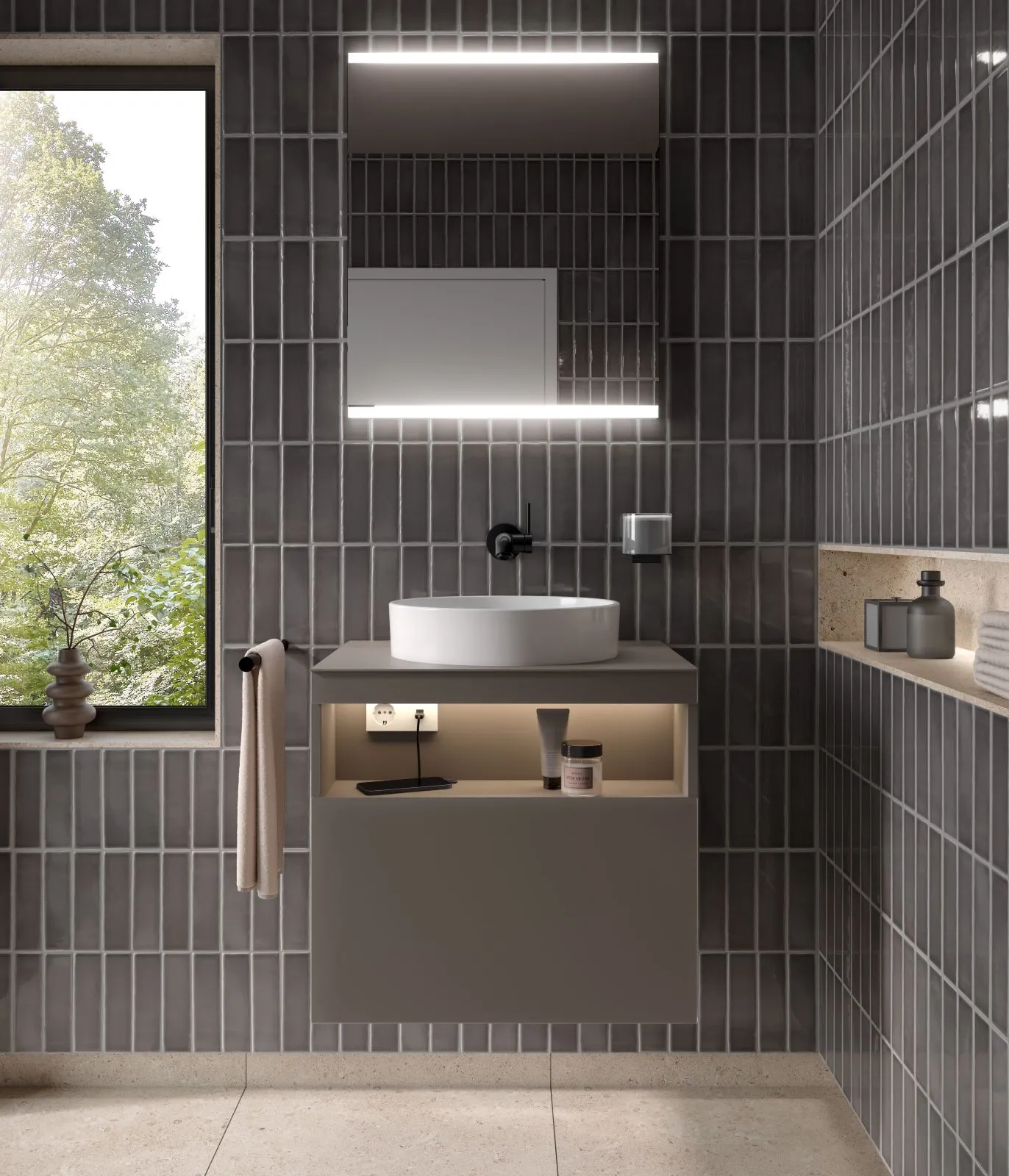 Per guadagnare centimetri preziosi nei bagni piccoli può essere utile sfruttare le pareti anche in altezza, con moduli a colonna quando possibile, scegliendo in aggiunta un mobile lavabo compatto ma completo, che integri anche lo specchio nel volume contenitivo superiore.
