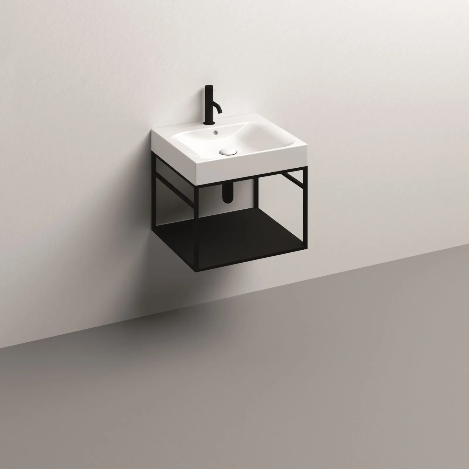 La struttura sospesa di struttura e lavabo di Kerasan in acciaio ha ripiano in metallo nero matt. È completa di lavabo bianco lucido. Prezzo, nella misura L 50 x P 45 cm, 760 euro. https://www.kerasan.it