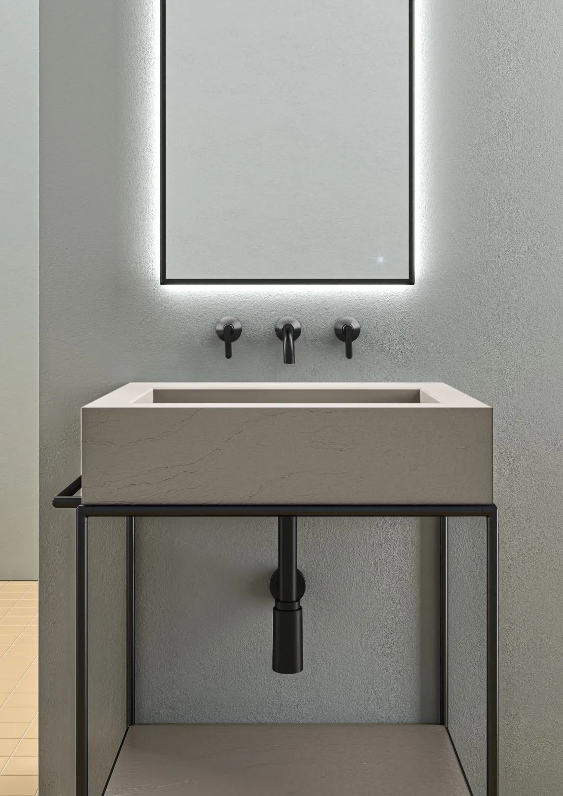 Il telaio Tuby System Alublack di Arblu sostiene il lavamani Animè in Well Ghiaia con ripiano. Misura L 60 x P 45,5 x H 74 cm e costa, Iva esclusa, 423 euro. Prezzo del top piano per ripiano in Well Ghiaia nella misura L 60 x P 45,5 cm, Iva esclusa, 325 euro. https://www.arblu.it