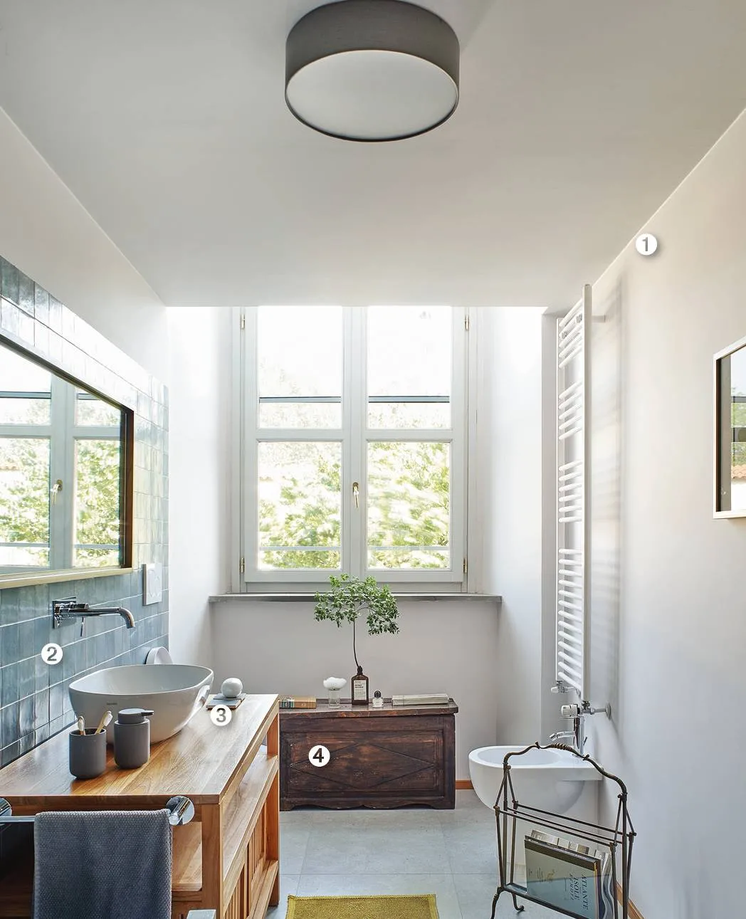 Bagno Progetto Studio Caramob, Milano – Foto Marco Menghi – Styling Laura Tocchet. ➊ Alcune pareti e soffitto tinteggiati in grigio perla con un’idropittura lavabile e traspirante ➋ Piastrelle lucide rettangolari per la parete del lavabo; opache e in formato large a pavimento. In entrambi i casi sono di Marazzi. https://www.marazzi.it ➌ Accessori Zone, acquistati su Amazon. https://www.amazon.it ➍ Piccola cassapanca vintage di recupero.