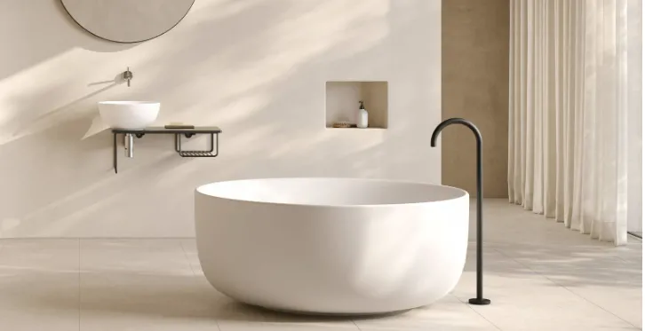 Coordinare lavabo, piatto doccia e accessori nella stessa palette contribuisce a creare continuità materica, quasi fossero elementi di un unico sistema.
