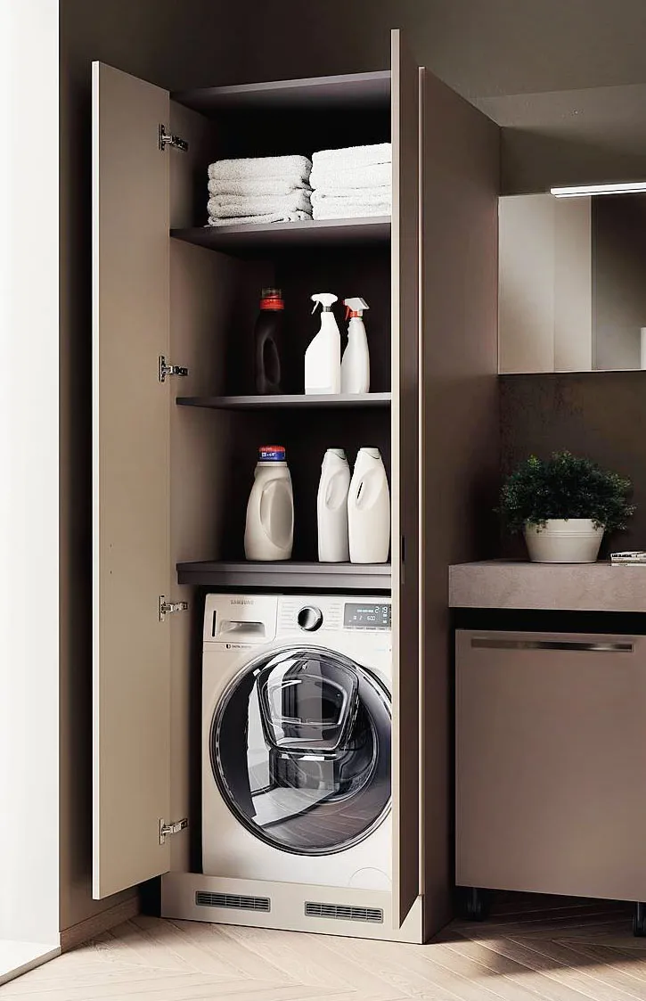 Da luogo di passaggio a snodo multifunzionale, un locale secondario – antibagno o disimpegno – può ospitare dotazioni per una lavanderia. Non sempre è possibile avere una stanza interamente dedicata alla pulizia e alla cura degli abiti. Eppure, tutto il necessario – grandi apparecchi, tavola e ferro da stiro, cesti per la biancheria sporca e pulita, detersivi – si può collocare agevolmente sfruttando lo spazio in altezza. Trasformare la zona che introduce il bagno, peraltro obbligatoria se la cucina è a vista, può essere dunque un ottimo éscamotage, soprattutto se si opta per le tante soluzioni compositive disponibili. Che alla flessibilità aggiungono la personalizzazione spinta degli accessori interni e delle finiture.
