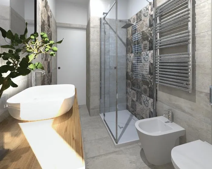 Nel bagno, progettato alcuni anni fa, il nuovo rivestimento in una tonalità neutra e chiara non appesantisce l’ambiente, ma non si è rinunciato a un tocco di colore e contemporaneità grazie a inserti decorativi tipo cementina, nella parete di fondo della doccia, con un richiamo sulla parete frontale accanto al mobile lavabo bianco con lavabo da appoggio e top a mensola in legno che armonizza il tutto.