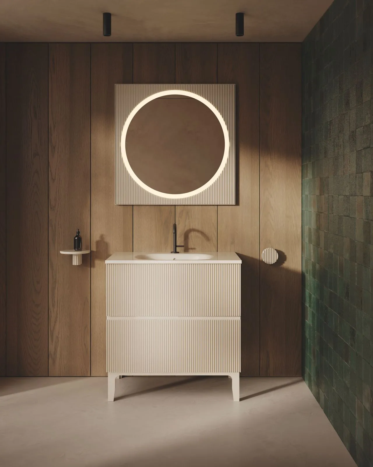 Gisele di Ceramica Globo è una collezione firmata da Angeletti Ruzza che combina ceramica e materiali differenti. Emblematica è la reinterpretazione del cannettato anni Trenta e Quaranta, sviluppata attraverso un lavoro di sintesi sulle proporzioni e sulla profondità della superficie. Gli smalti pieni e compatti per la finitura lucida “Riflessi di Luce” esaltano i volumi del cannettato. I mobili a terra sono disponibili nelle misure L 70 o 85 × P 50 cm sono proposti sia con lavabo integrato sia con piano in ceramica progettato per accogliere una selezione di lavabi coordinati al design della linea. In foto mobile da 85 cm con lavabo L 86 x P 51 cm, in finitura lucida (Riflessi di Luce – SAND). https://www.ceramicaglobo.com – Salone del Mobile 2026, padiglione 10, Stand A02-A04.