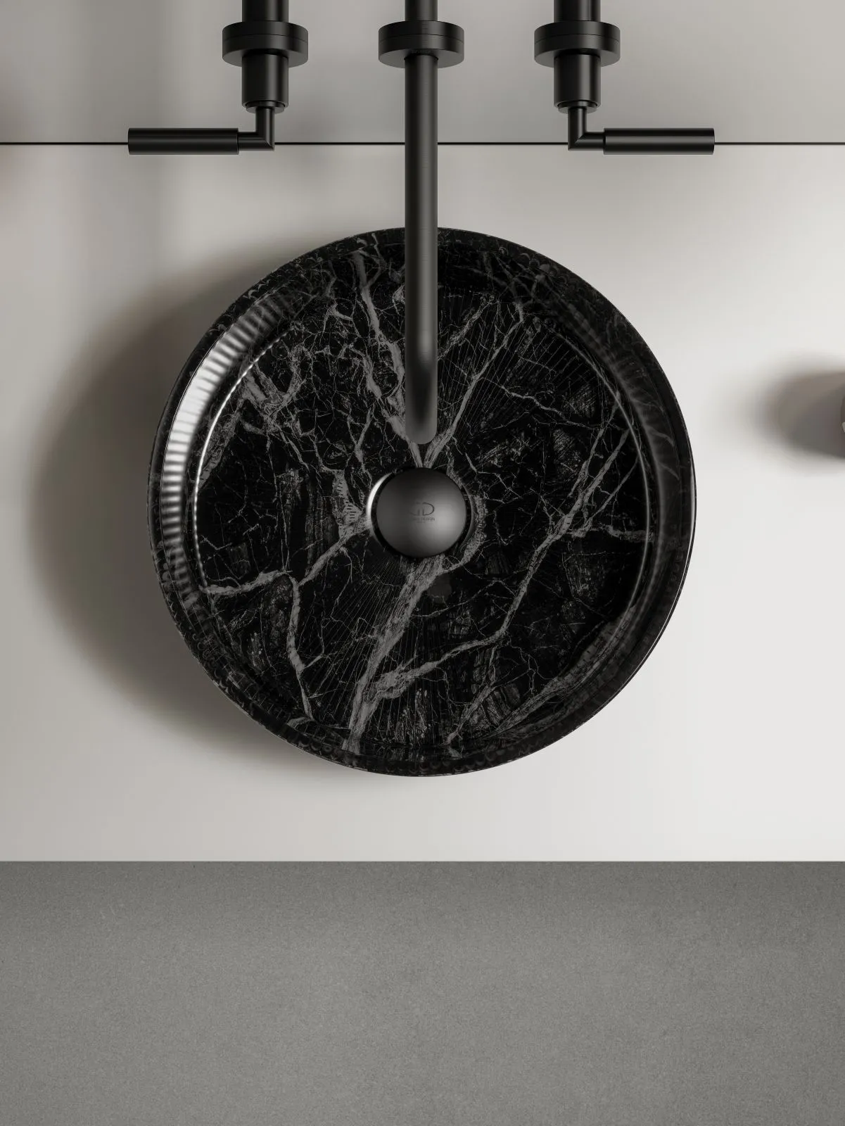 Madison Marmoral di Glass Design è un nuovo lavabo da appoggio in vetro Florence Glass ATELIER® con base circolare e l’estetica del marmo Black Marquina. È sorprendente come con il vetro si riesca a riprodurre l’eleganza senza tempo del marmo con le sue profonde venature chiare su fondo nero e la finitura lucida. Misura Ø 40 x H 15 cm. https://www.glassdesign.it – Salone del Mobile 2026, padiglione Pad. 6, Stand B35.