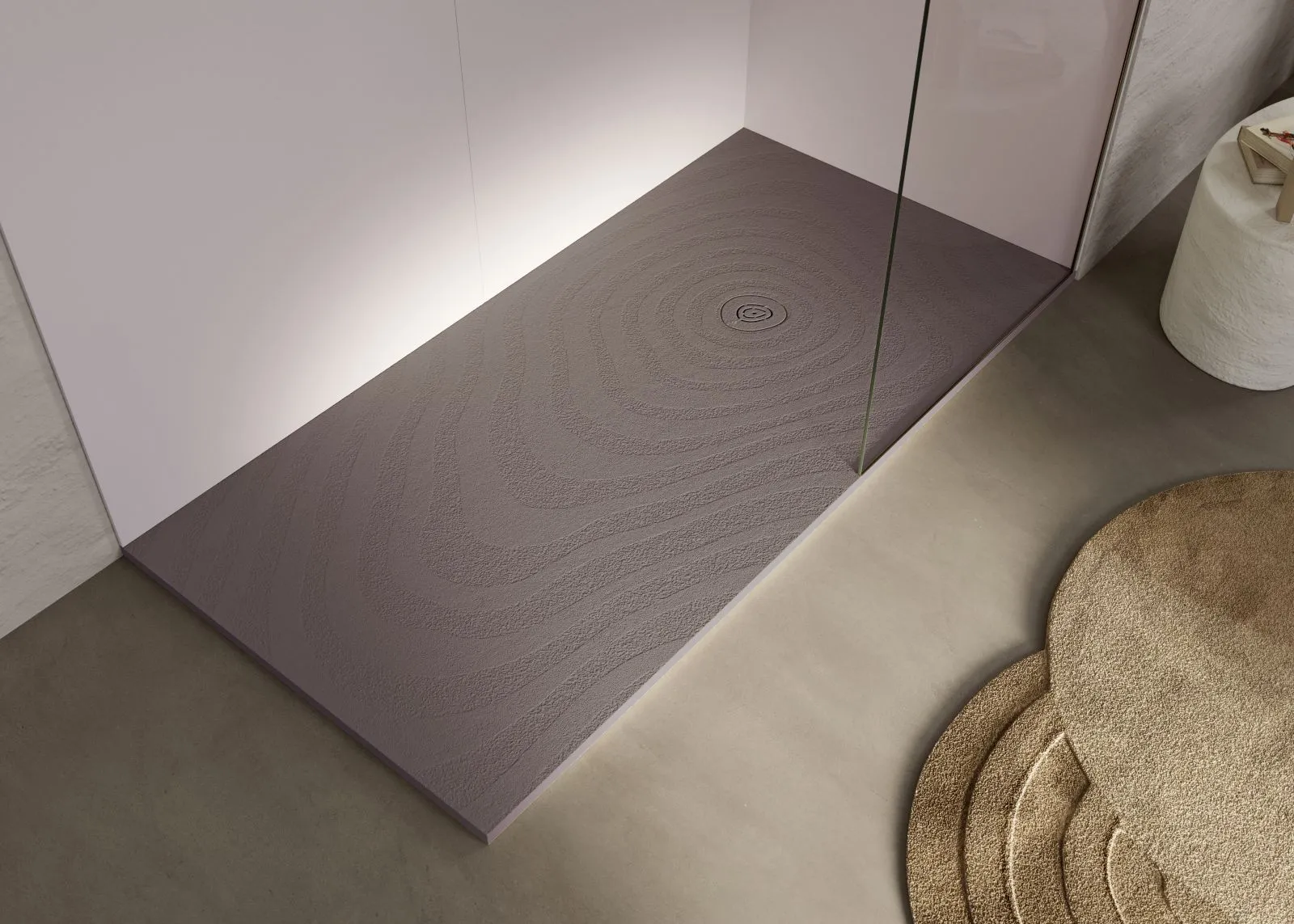 La texture “ondulata” del piatto doccia Natur Wave Forest di Acquabella ricorda delicate increspature sabbiose che si estendono dalla griglia di drenaggio circolare, diventando sempre più ampie e ricoprendo l’intera superficie del piatto. È realizzato, come tutti i piatti doccia dell’azienda, in Akron®, materiale senza silice brevettato Acquabella. Akron® unisce le qualità del poliuretano alle cariche minerali ed è trattato su tutta la superficie con un rivestimento, anch’esso in poliuretano. È un materiale igienico, resistente a urti e shock termici e finiture ad alta definizione. https://www.acquabella.com – Salone del Mobile 2026, padiglione 10, Stand di Calibe A03.