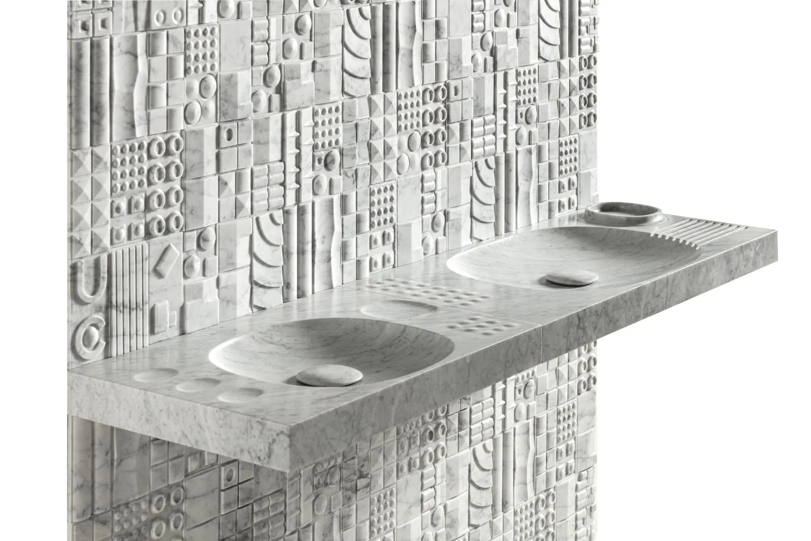 Progettato da Martinelli Venezia per Lithea il sistema-lavabo a mensola Sorgente è una micro-architettura che riporta le tracce dei paesaggi su superfici modellate da cavità, curve e rilievi. È composto da due moduli distinti in marmo Bianco Carrara. Ciascun modulo è caratterizzato da una specifica composizione di vasche scavate, elementi convessi e mini-contenitori incassati: ai lavabi si affiancano piccole sfere emergenti dalla materia, che funzionano come piani di appoggio, mentre le ciotole concave possono essere utilizzate per oggetti e accessori. I due moduli possono essere accostati tra loro, alternati, replicati oppure utilizzati singolarmente. La dimensione longitudinale corrisponde ai moduli di diverse pareti Lithea così il sistema-lavabo si allinea ai rivestimenti. Il Modulo A misura L 1,12 x P 52 x H 8 cm, quello B L 80 x P 52 x H 8 cm. Foto: NinoBartuccio. https://www.lithea.it – Salone del Mobile 2026, padiglione 18, Stand B08.