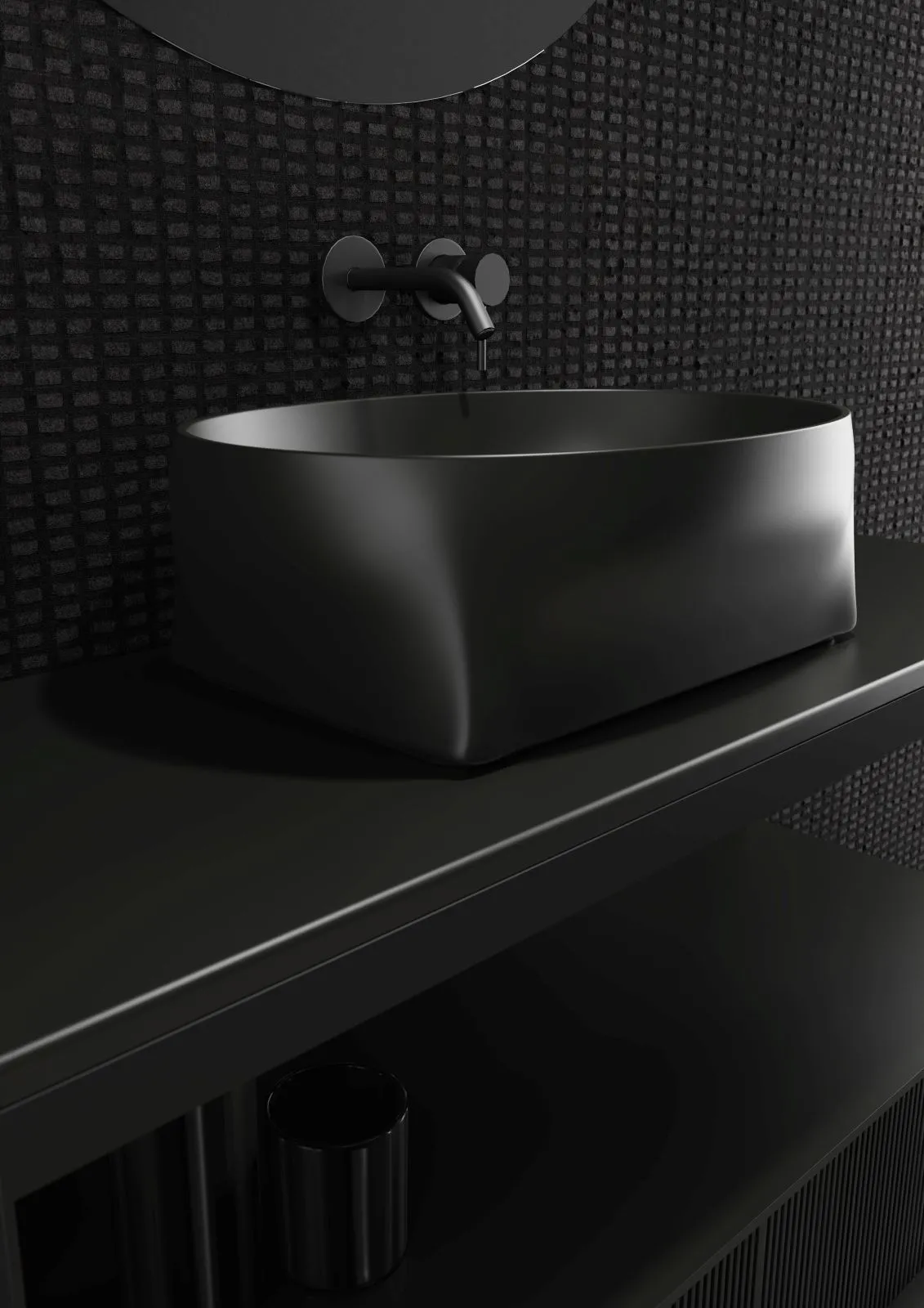 Le finiture scure e materiche dialogano con lavabi dalle cromie inaspettate, spesso opache e sofisticate, capaci di diventare veri elementi focali.