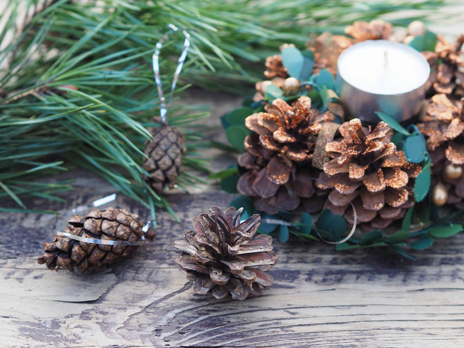 - incollare qualche foglia in modo che spunti fuori dalle pigne, aggiungendo punti di luce