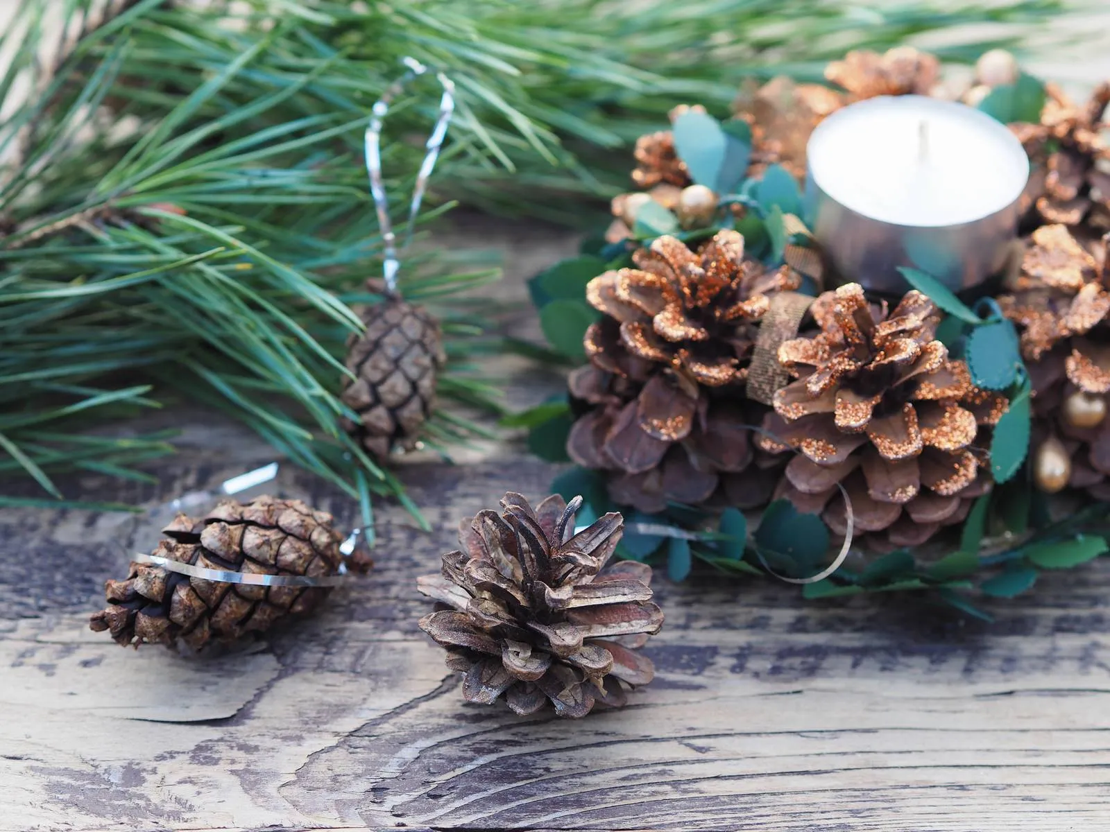 Una volta essiccate, le pigne si possono usare al naturale o trattare con vernice spray color oro, argento o bianco neve. In alternativa, è possibile anche spalmare della colla vinilica sui bordi delle scaglie e cospargerle di glitter. La scelta dipende dal tipo di decoro che si vuole ottenere, se rustico e country, oppure shabby e romantico.