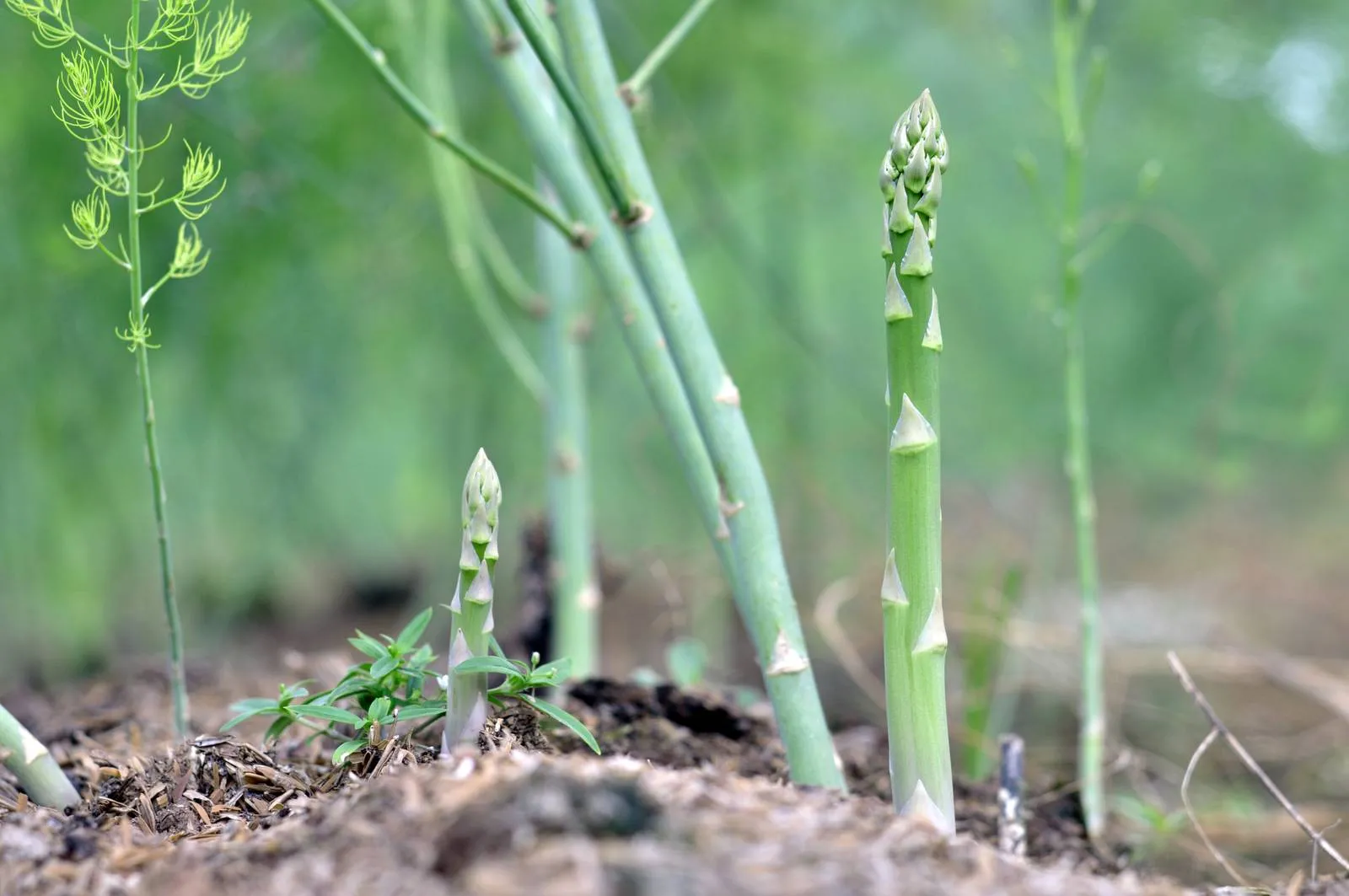 - Dal terreno, si sviluppano i turioni della pianta dell’asparago, ossia la parte commestibile usata in cucina.