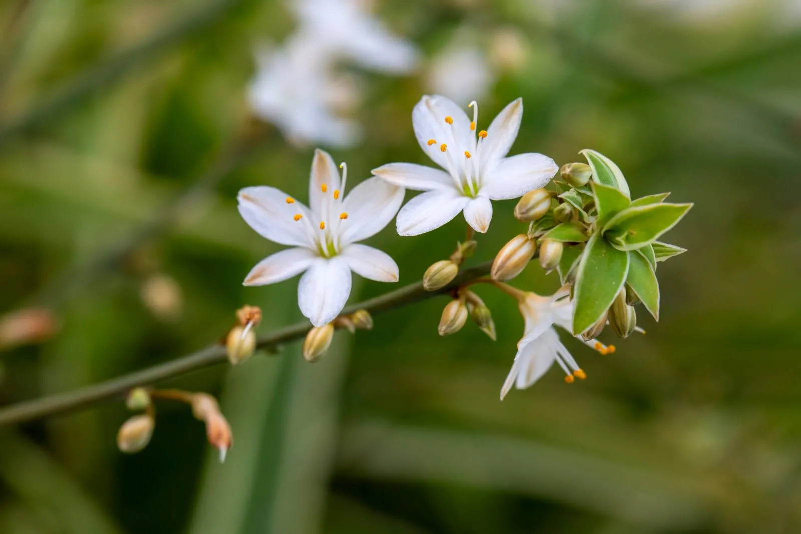 - I fiori di falangio hanno una caratteristica forma a stella e colore bianco.