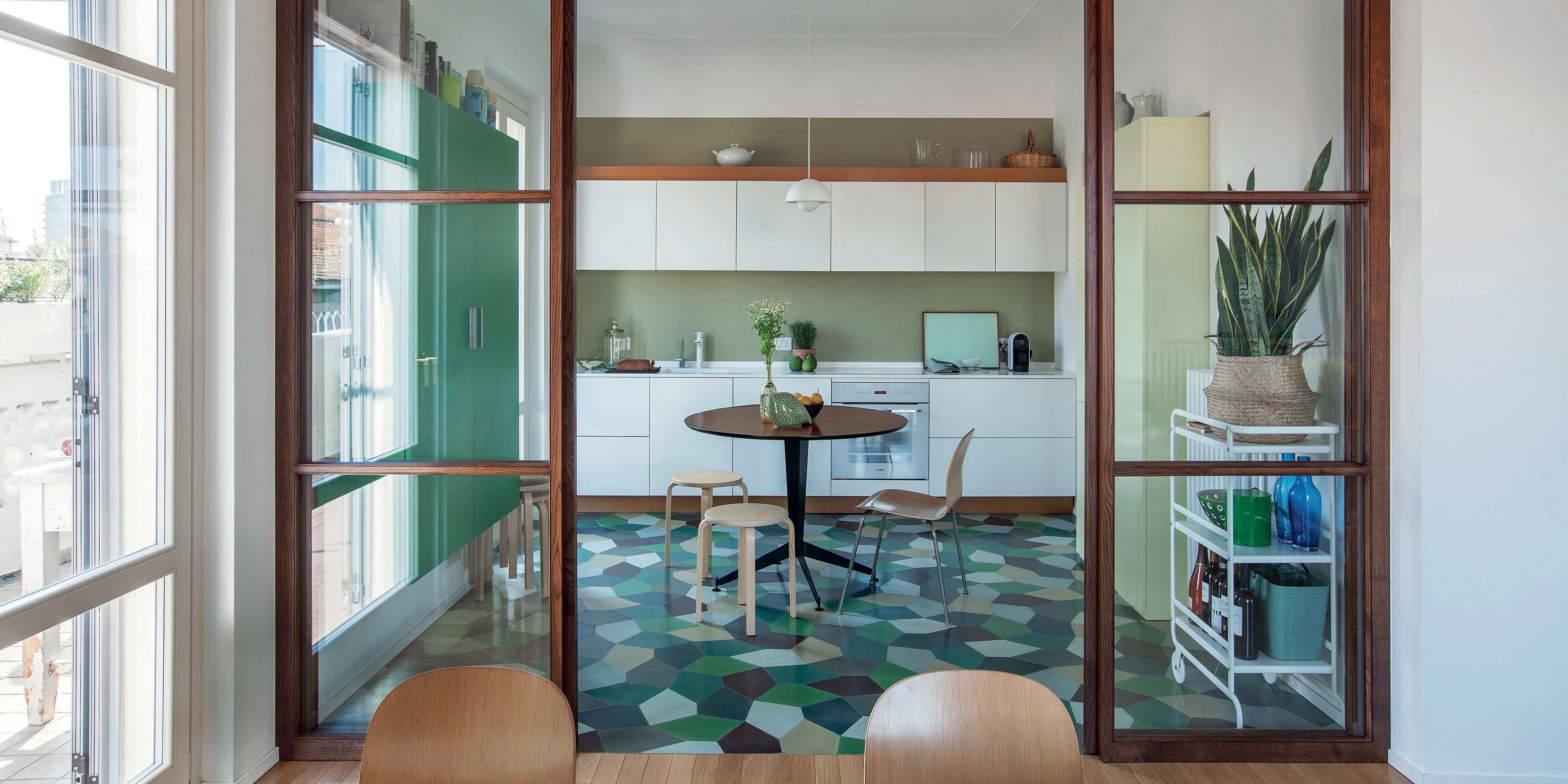L’appartamento ristrutturato di 107 mq è al terzo piano. In passato la distribuzione interna prevedeva il doppio utilizzo dell’immobile che era allo stesso tempo abitazione e studio medico del proprietario; il progetto ha quindi modificato in modo radicale il layout e di conseguenza gli impianti. Ora un locale tecnico centrale di nuova realizzazione fa da snodo ai percorsi dell’appartamento ristrutturato. Nuovi elementi architettonici, tra cui uno scenografico camino su disegno, contribuiscono a separare le funzioni e a definire la morfologia degli ambienti. L’ingresso, a una quota di pavimento inferiore rispetto al resto della casa per motivi tecnico-impiantistici, interpreta anche una caratteristica tipica delle case giapponesi. Anche il colore svolge un ruolo importante nella definizione degli spazi: protagonista delle finiture è il verde petrolio, contrapposto al bianco, in un gioco di rimandi tra un ambiente e l’altro. Lo stile dell’appartamento ristrutturato è contemporaneo, con arredi su disegno, luci tecniche e lampade di design, pochi elementi decorativi; d’ispirazione più tradizionale sono invece il parquet con posa a spina di pesce all’italiana e il marmo bianco di Carrara in cucina, scelta ricercata in un contesto minimal.