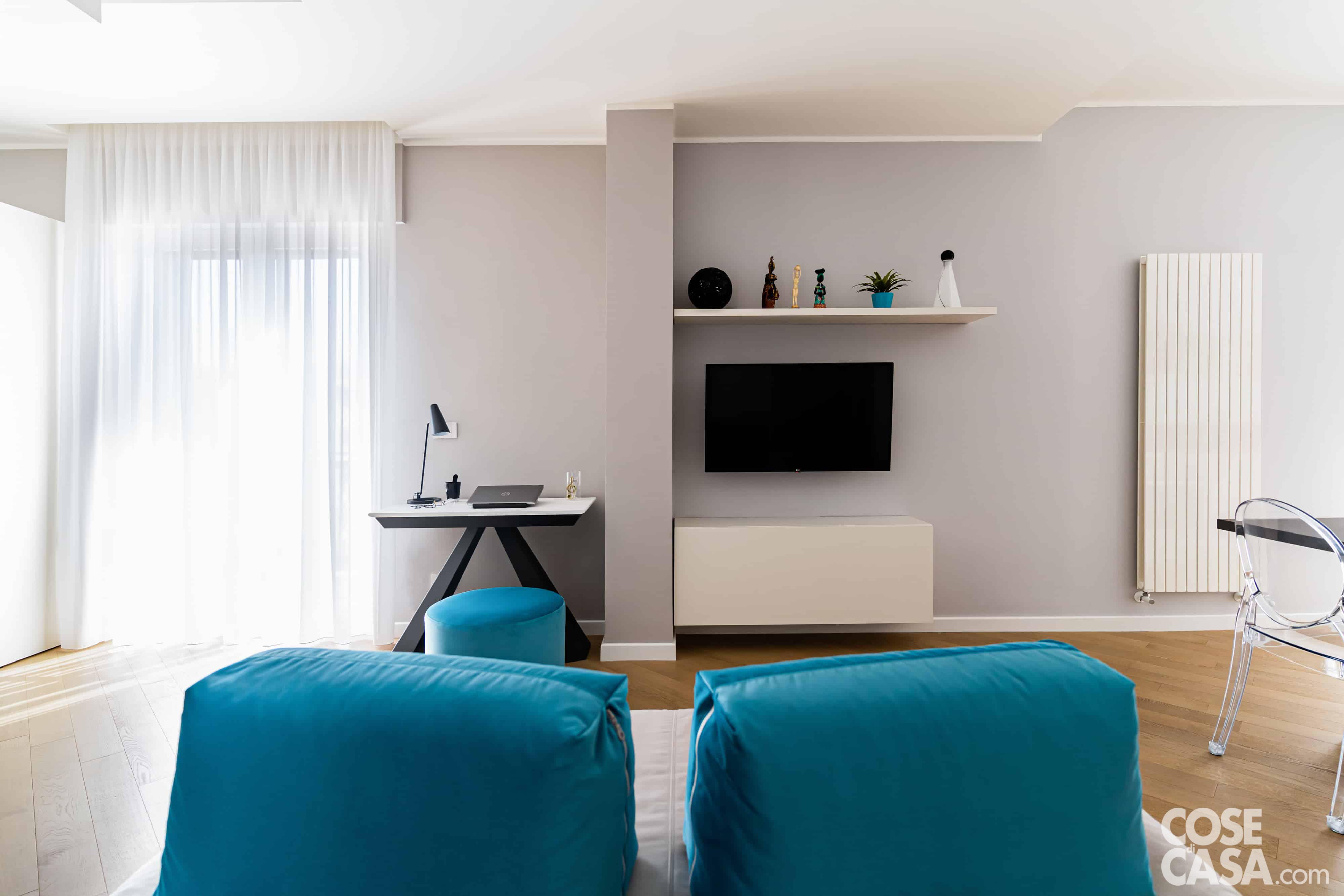 Il pilastro lungo la parete esterna diventa elemento di discrimine tra zona tv e studio. La console allungabile (di Cattelan) che fa da scrivania per l’arrivo di eventuali ospiti si può trasformare in tavolo per 14 persone. Basta spostare un po’ il divano per l’apertura e avere delle sedie pieghevoli riposte in cantina o in un ripostiglio.