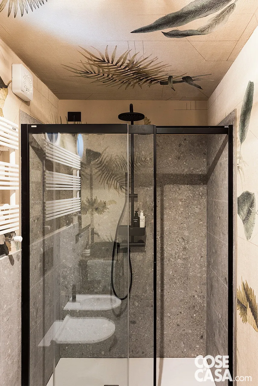 Ritagliato da quello principale, il bagno a uso della stanza matrimoniale è un piccolo gioiello impreziosito da una tappezzeria che incrocia grafiche architettoniche a temi e colori ispirati alla natura. A questo rivestimento di grande impatto decorativo è abbinata una sorta di boiserie, in gres effetto pietra, che protegge la zona vicino al lavabo e scende a pavimento