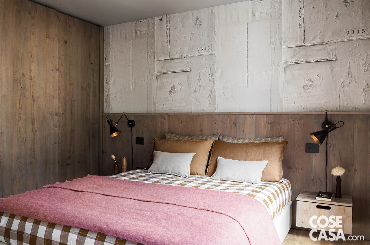 Anche la camera matrimoniale trasmette un carattere inconsueto attraverso l’utilizzo puntuale di pattern, colori e finiture a sorpresa. Ancora una volta sono protagoniste le pareti: quella di fondo è rivestita nella parte superiore con una carta da parati effetto muro grezzo, accoppiata a una boiserie in legno che fa da testata al letto e si congiunge all’armadio a muro, sempre nella stessa finitura. Integrati alla boiserie, i comodini minimal
