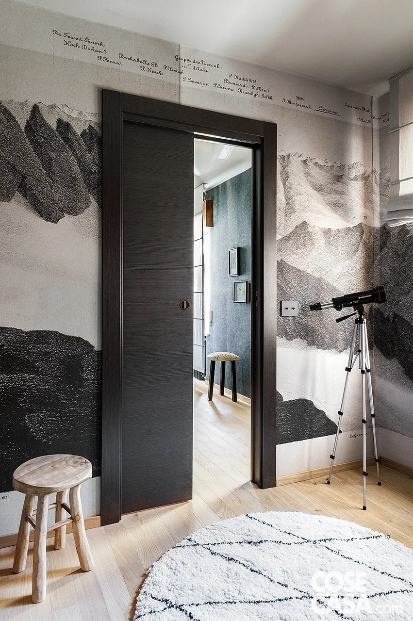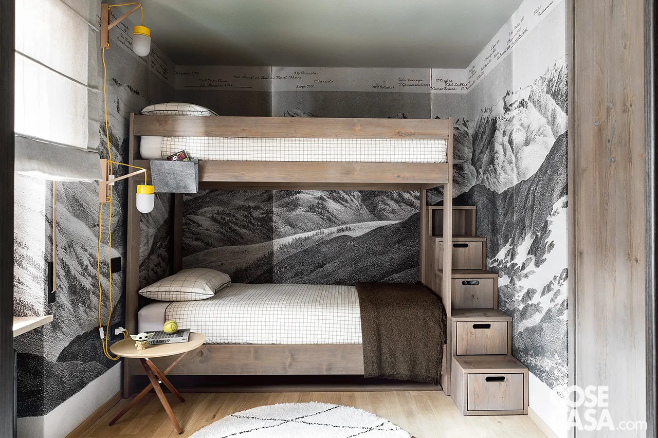 Nella camera dei ragazzi, che anticipa ed è contigua a quella matrimoniale, ci si immerge in una sorta di paesaggio ovattato. Le pareti intorno al letto a castello, corredato da una pratica scaletta con gradini-cassetti, riproducono su grande scala il disegno di una catena montuosa. È un’immagine in bianco e nero che accoglie bene la finitura “grigiastra” degli arredi in legno. Le applique gialle aggiungono una piccola quota di colore sufficiente a vivacizzare l’insieme