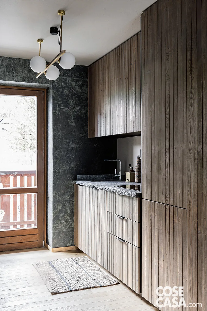 La cucina è concentrata su un’unica parete in prossimità della portafinestra che affaccia su un balcone. La composizione si caratterizza per la finitura a doghe, ottenuta con listelli impiallacciati con uno strato di legno antico, trattato con una tinta acrilica scelta a campione. Il trattamento superficiale evidenzia i nodi e le venature del legno. Il piano di lavoro è in pietra naturale di Luserna con bordi rifiniti a scalpello per conferirle un aspetto raw ricercato.