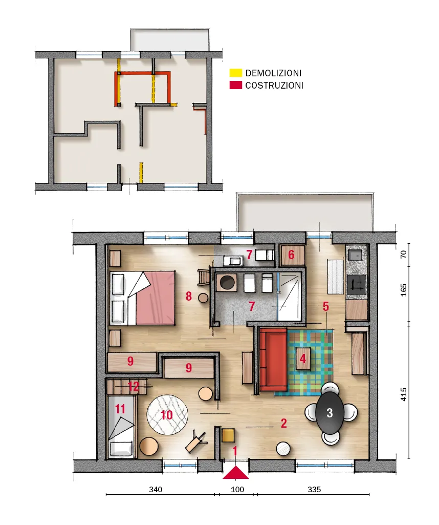 1 Ingresso 2 Zona giorno 3 Pranzo 4 Salotto5 Cucina 6 Nicchia con elettrodomestici 7 Bagno 8 Camera matrimoniale 9 Armadio 10 Cameretta 11 Letto a castello 12 Scaletta