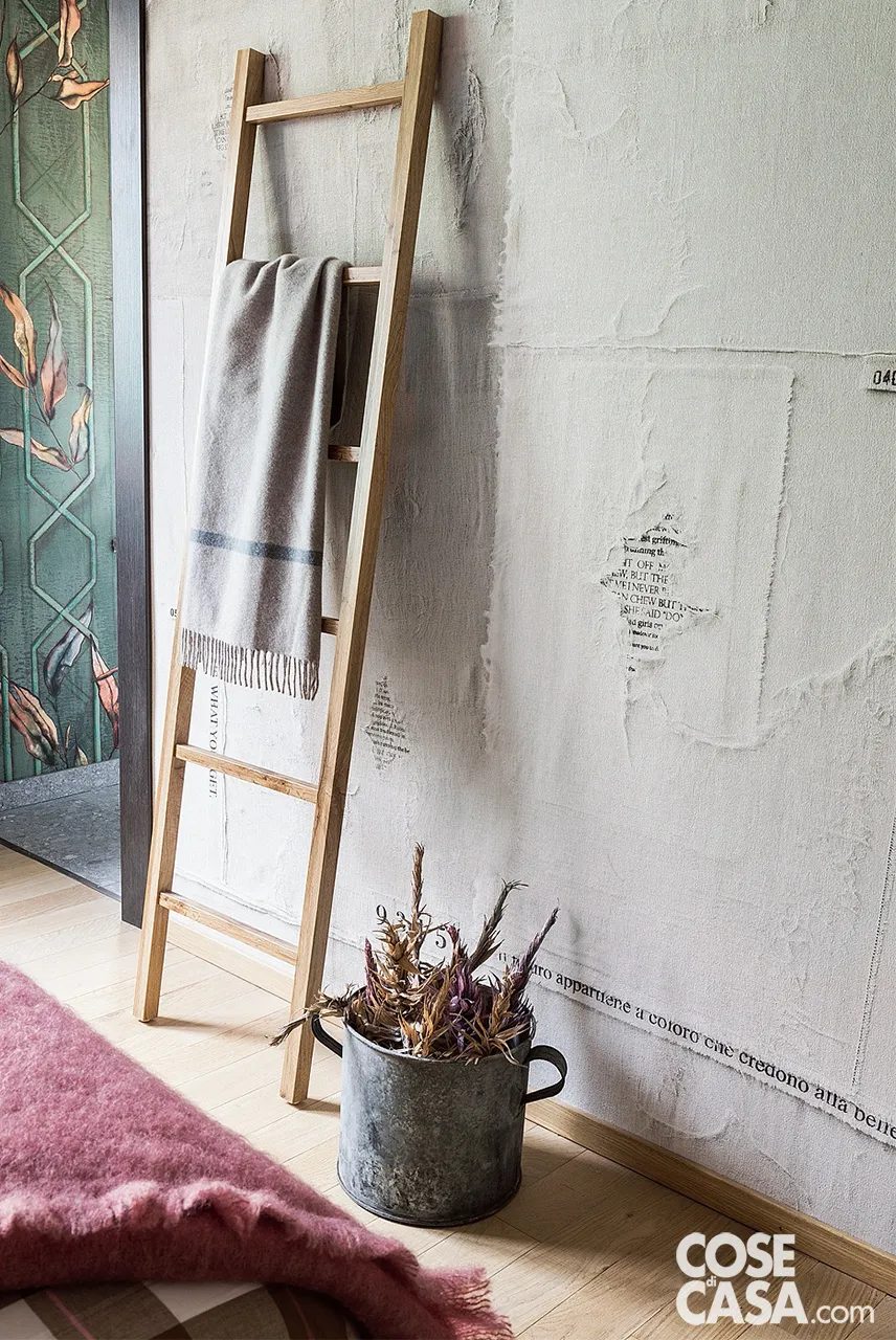 In camera, una scaletta di recupero in legno naturale sostituisce il tradizionale servomuto. Di fianco, un vaso in metallo di Zara Home con rami secchi è una delle poche note décor. Affidate in questo progetto alle carte da parati.