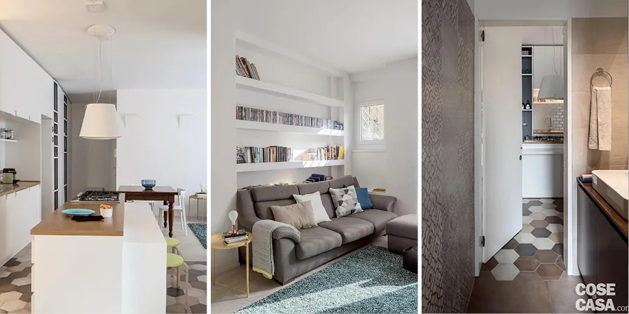 A sinistra, arabeschi, quadretti, fiori, e pattern diversi rivestono le pareti: sono piastrelle posate a schema libero, ma cromaticamente coordinate. A destra, le piastrelle esagonali della cucina si innestano direttamente in quelle maxi del bagno. Senza un’interruzione netta, il risultato è decisamente gradevole.