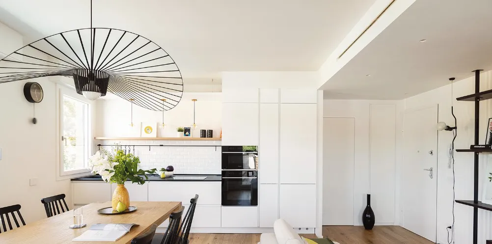 Le finiture in bianco delle grandi superfici e il gioco alternato dei cambi di quota a pavimento e a soffitto danno respiro al living: tutto è più aperto e luminoso, complice lo stile leggero ed essenziale del design scandinavo, che fa percepire visivamente più ampio il trilocale.