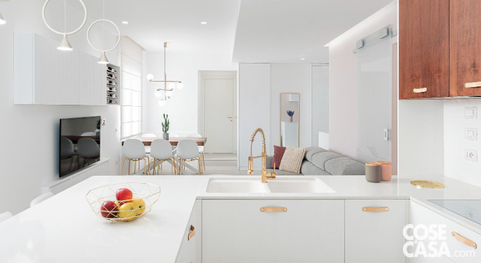 Nell’ampio e luminoso living openspace, che comprende soggiorno, zona pranzo e cucina, domina il bianco di pareti, soffitti, arredi e serramenti, con dettagli in rosa cipria e grigio introdotti dagli elementi tessili e dagli accessori. Brillano, poi, alcuni particolari – quali i rubinetti e le gambe delle sedute – che hanno finitura in ottone o metallo dorato. Mentre altri – come il piano del tavolo e le maniglie delle ante in noce canaletto, pelle e cuoio – hanno il compito di scaldare l’insieme. Sul fondo, la porta nel disimpegno che dà accesso a una delle due camerette è di Bertolotto (www.bertolotto.com).