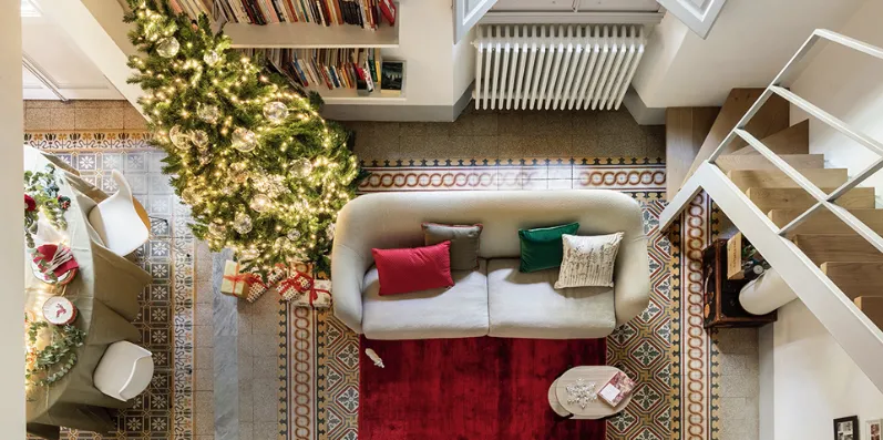 Nel soggiorno a doppia altezza, dove affaccia la balconata del sottotetto, la zona conversazione è arredata con il divano Pilotis di De Padova impreziosito con cuscini di l’Opificio e Fazzini, poltrone vintage, come la madia, e tavolino Madame di Calligaris. A raccordarli, il tappeto Kama di GT Design. Sotto la scala, illumina la composizione di quadri la lampada Parentesi di Flos. L’albero di Natale è di Vertecchi,le carte dei pacchetti di Grafiche Tassotti.