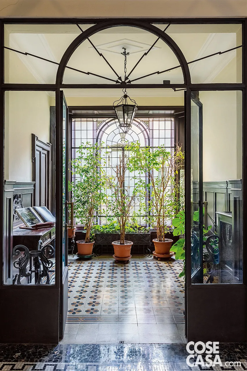 - Tratto tipico delle case d’epoca, l’ingresso ha una bussola con doppia porta: quella interna è formato da ante per metà cieche e per metà a vetro.