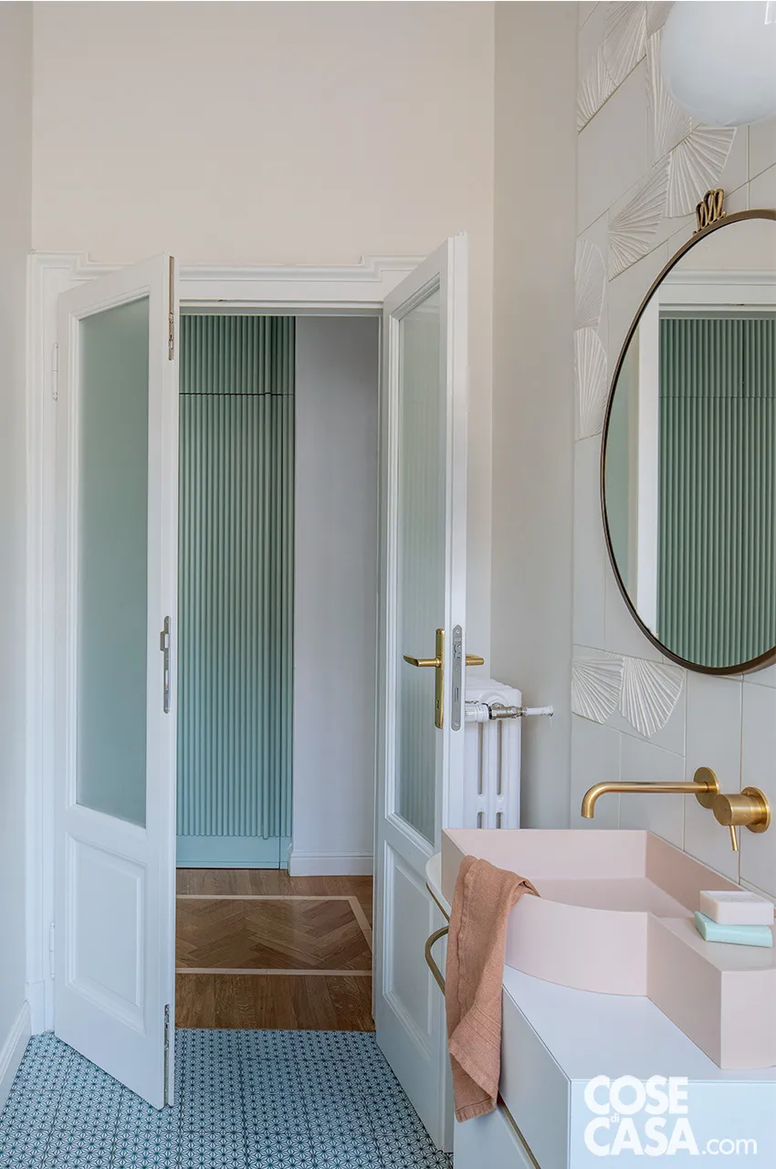 In sintonia con il profilo della boiserie e la palette di colori pastello, il lavabo in un delicato rosa cipria è Nouveau di ex.t. È abbinato alla rubinetteria a parete con finitura dorata Mini B di Bellosta Rubinetterie, in accordo alla barra portasalviette del mobile, sopra la quale c’è un asciugamano in lino effetto crêpe Crel di Society. L’insieme d’antan si intona con il motivo a rilievo delle piastrelle a parete Flora di Botteganove. A terra, piastrelle in pietra lavica maiolicata di Made a Mano.