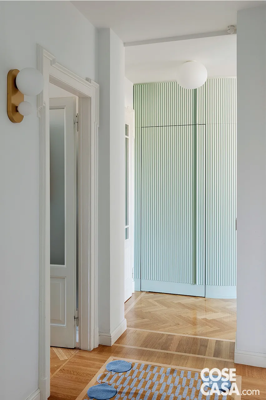 L’ingresso è uno dei nodi della ristrutturazione: a sinistra della porta, le pareti che definivano un ampio ambiente adibito a cabina armadio sono state sostituite da una “boiserie cannettata” dal profilo arrotondato, rifinita in una delicata tonalità verde pastello.