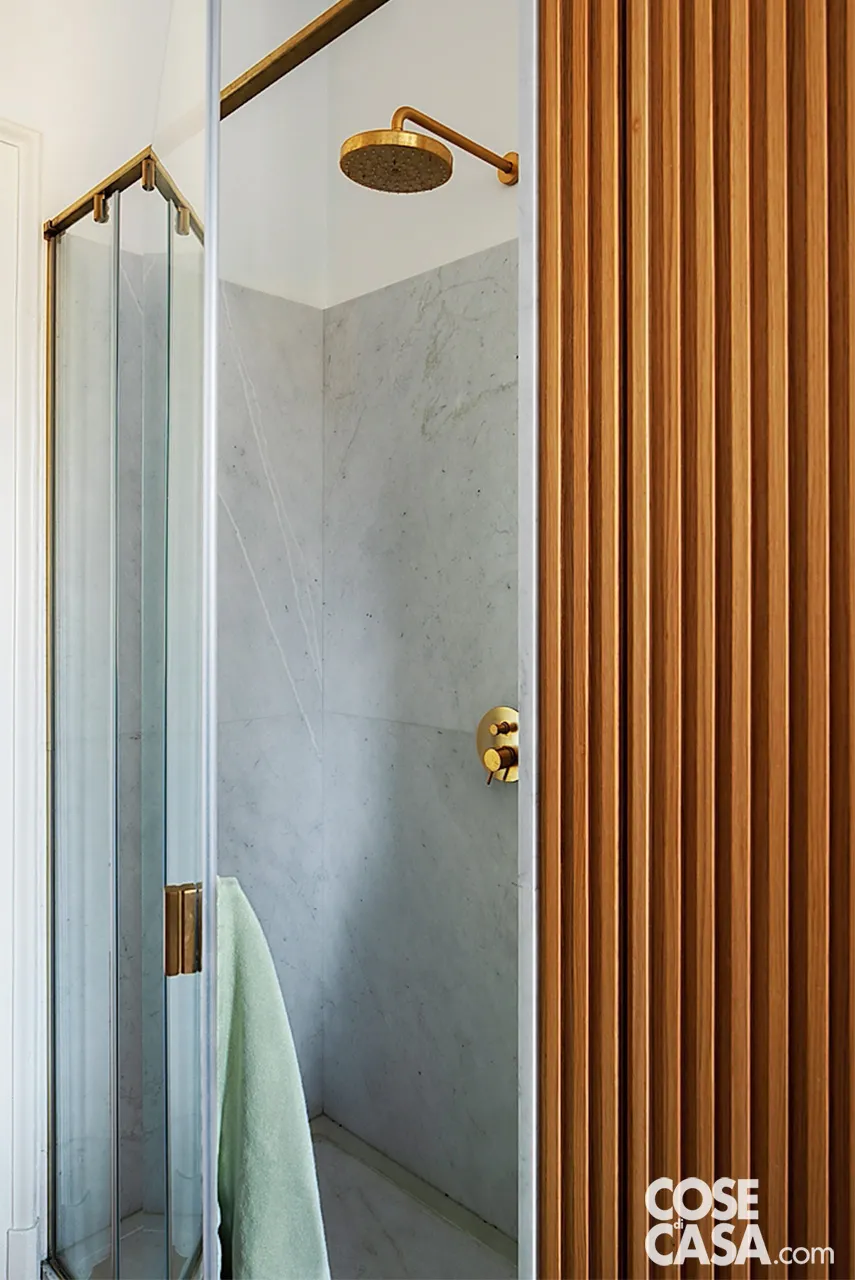 Nel bagno principale la doccia rivestita in marmo (Interno 18) è stata spostata verso la parete. Al posto di quella preesistente è stato inserito un mobile a listelli di rovere, realizzato da Figini, che media il passaggio alla zone con il lavabo e i sanitari.