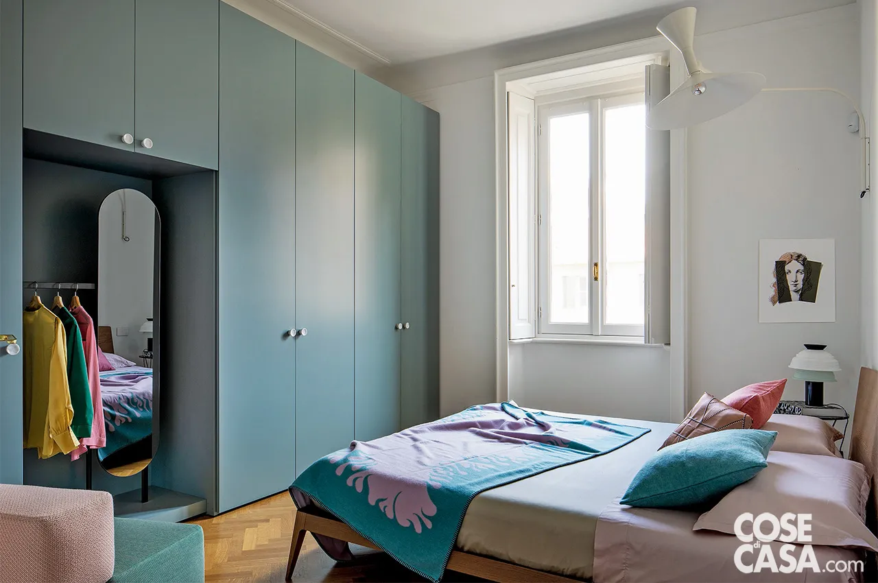 Nella camera matrimoniale rivivono, con nuance più marcate, le tonalità che punteggiano gli altri ambienti: il verde pastello sfuma nel verde-azzurro dell’armadio, del plaid e del cuscino; il rosa pastello vira verso il cipria e il corallo.