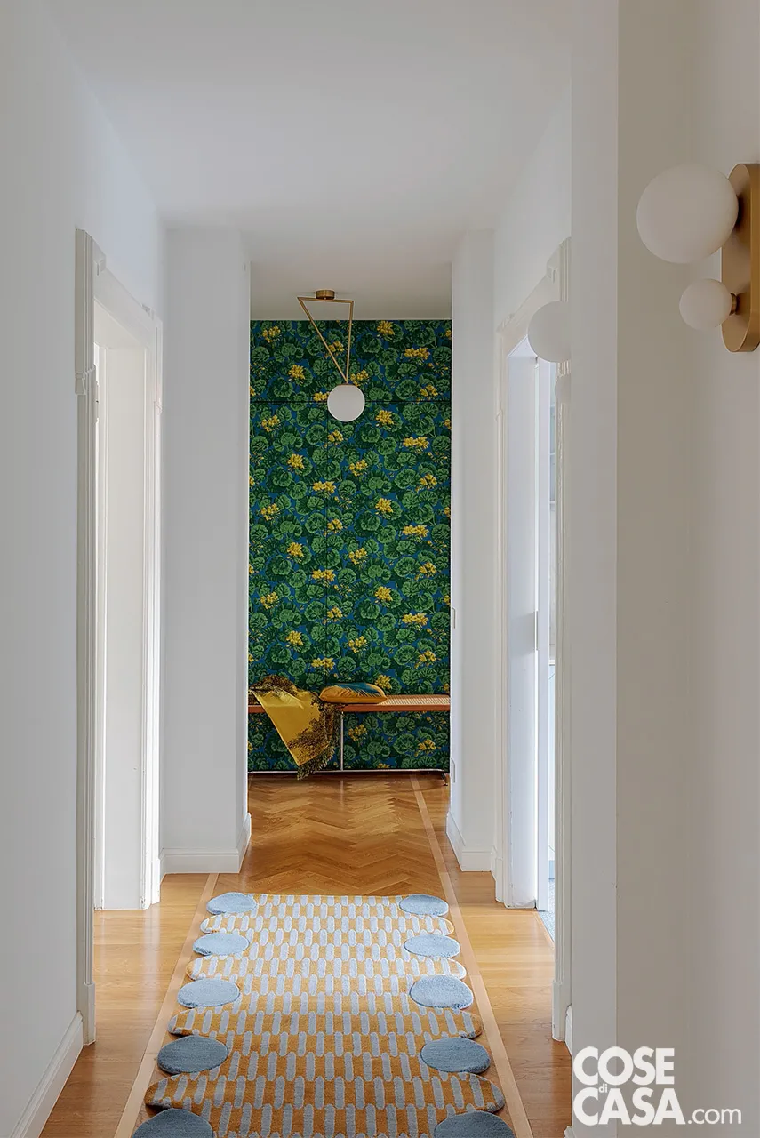La passatoia in corridoio Couloir Paysage, design Maison Matisse, di CC Tapis è incorniciata dal bindello che disegna il nuovo parquet in massello di rovere di Cp Parquet. L’applique con doppia sfera in vetro bianco e sostegno in metallo dorato è Perspective variation di Atelier Areti.