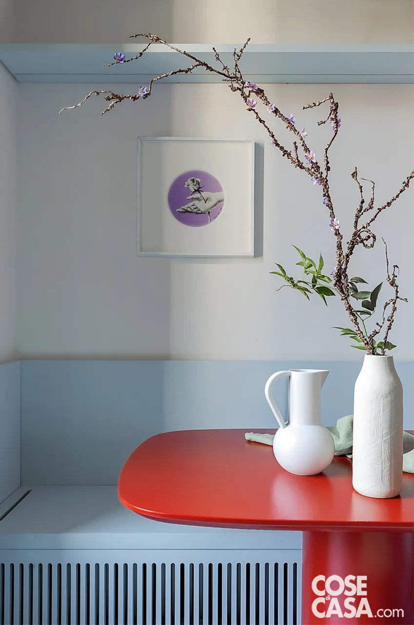 La cucina in legno laccato opaco con maniglie in ceramica bianca è realizzata su progetto dell’architetto da Proma Interni. Il top e lo schienale sono in marmo di Carrara (da Interno 18). La sospensione è Cirque di Louis Poulsen. A pavimento, piastrelle in pietra lavica maiolicata di Made a Mano. Sul tavolo, abbinato a una panchetta contenitore dal frontale simile ai copricalorifero del living, la brocca e il centrotavola sono di Raawii. Il canovaccio verde è di Society. Sulla parete, quadro di Clara Brasca, da Galleria l’Affiche.