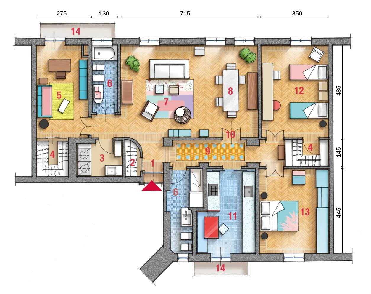 1 Ingresso 2 Guardaroba 3 Lavanderia 4 Cabina armadio 5 Studio/camera ospiti 6 Bagno 7 Soggiorno 8 Zona pranzo 9 Corridoio 10 Nuova porta sul living 11 Cucina 12 Camera bambini 13 Camera matrimoniale 14 Balcone