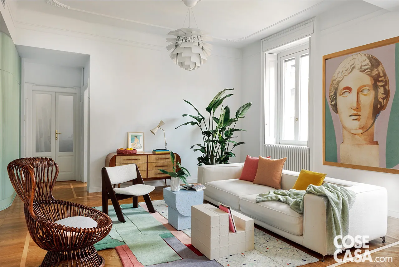 In soggiorno, davanti al volume verde acqua che chiude una zona di servizio accanto alla porta d’ingresso, la poltroncina vintage realizzata in canne di giunco è il modello Margherita, un pezzo originale degli Anni ’50 disegnato da Franco Albini (Galleria Compasso). Di fronte, tavolini-sgabello delle collezioni Le Zattere (quello arrotondato) e Fondamenta di Patricia Urquiola per Cimento®. Sulla madia, altro pezzo vintage, la lampada da tavolo Megafono di Stilnovo. A soffitto, la sospensione Artichoke di Louis Poulsen.