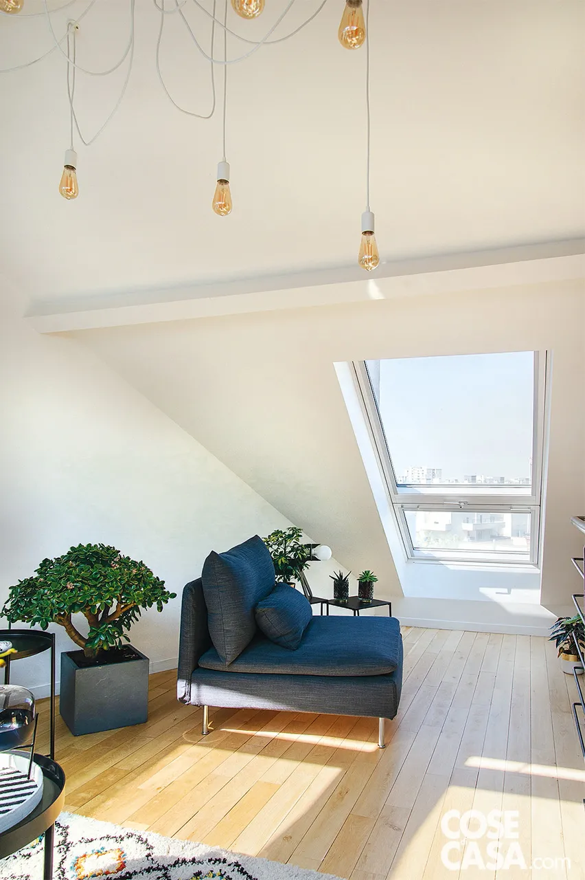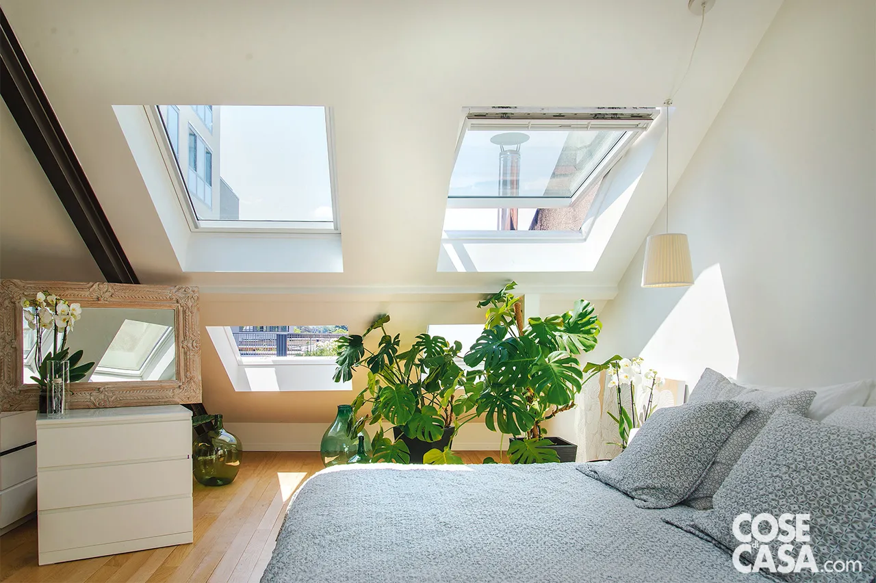 Sono stati installati nei diversi ambienti della casa: a partire dal soggiorno, dove le superfici vetrate in falda sono più ampie e numerose, fino alle camere e ai bagni, svolgono ovunque un ruolo fondamentale nel rinnovamento del sottotetto. Una distribuzione strategica che garantisce uniformità luminosa e comfort diffuso.