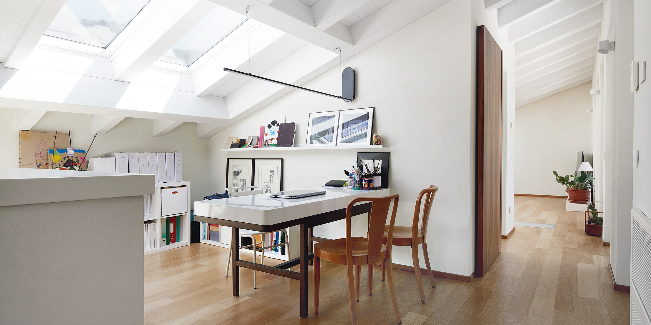 Il sottotetto comprende ampie aree che in passato restavano inutilizzate e che invece oggi sono state valorizzate sotto la nuova copertura coibentata, che integra sette finestre per tetto Velux (www.velux.it), per una ottimale distribuzione di luce naturale su tutta la superficie.