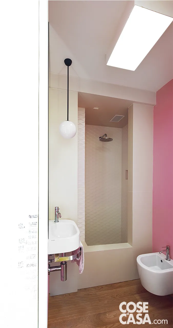 Il bagno con accesso diretto dalla cameretta, sebbene minimo nelle dimensioni – misura in tutto 2,46 mq – è attrezzato con vasca e doccia, grazie a una brillante soluzione salvaspazio cui è ricorsa la progettista.