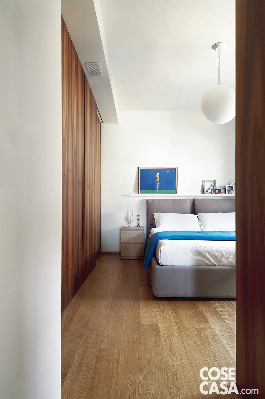 L’essenza di noce nazionale che fodera il disimpegno si ritrova nella camera da letto matrimoniale, dove è impiegata per le ante scorrevoli che chiudono un guardaroba walk-in.