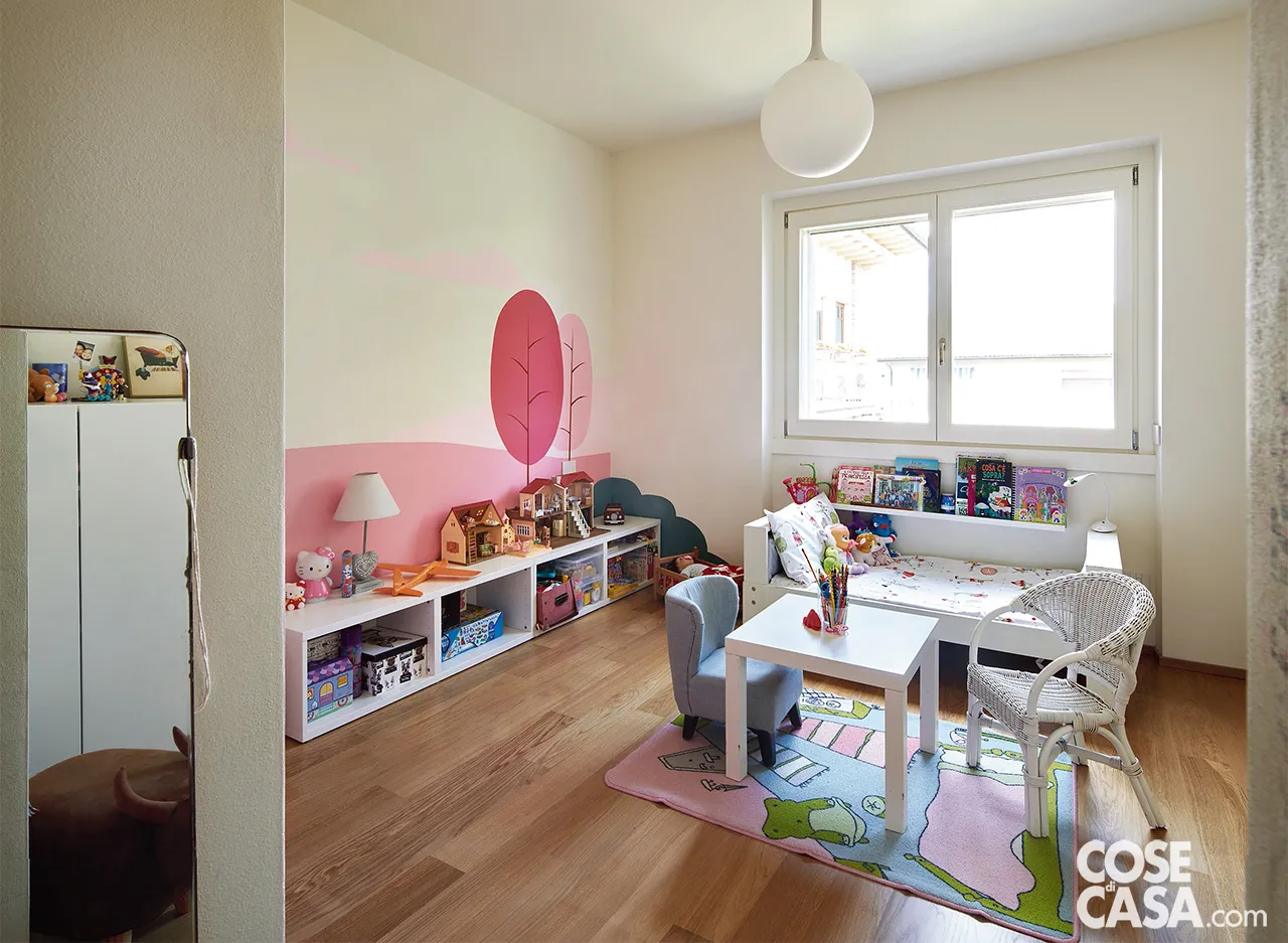 La camera da letto della figlia è stata progettata con attenzione per soddisfare esigenze specifiche: la semplicità favorisce la libertà di movimento, con arredi essenziali per contenere i giocattoli e servire da superfici d’appoggio quando necessario.
