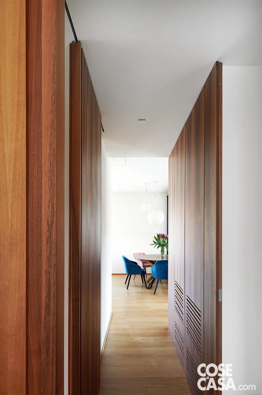 Il disimpegno fra le due camere da letto è rivestito con una boiserie in legno di noce nazionale realizzata, su disegno della progettista, da A.R. Falegnameria di Cinesi Arrigo.