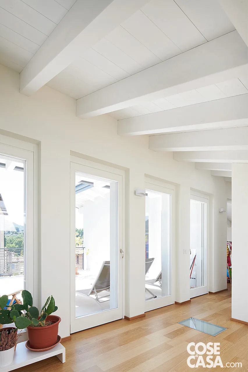 Le aperture orientate a est, sud e ovest sono state valorizzate con nuovi infissi in PVC bianchi che si uniformano ai muri.