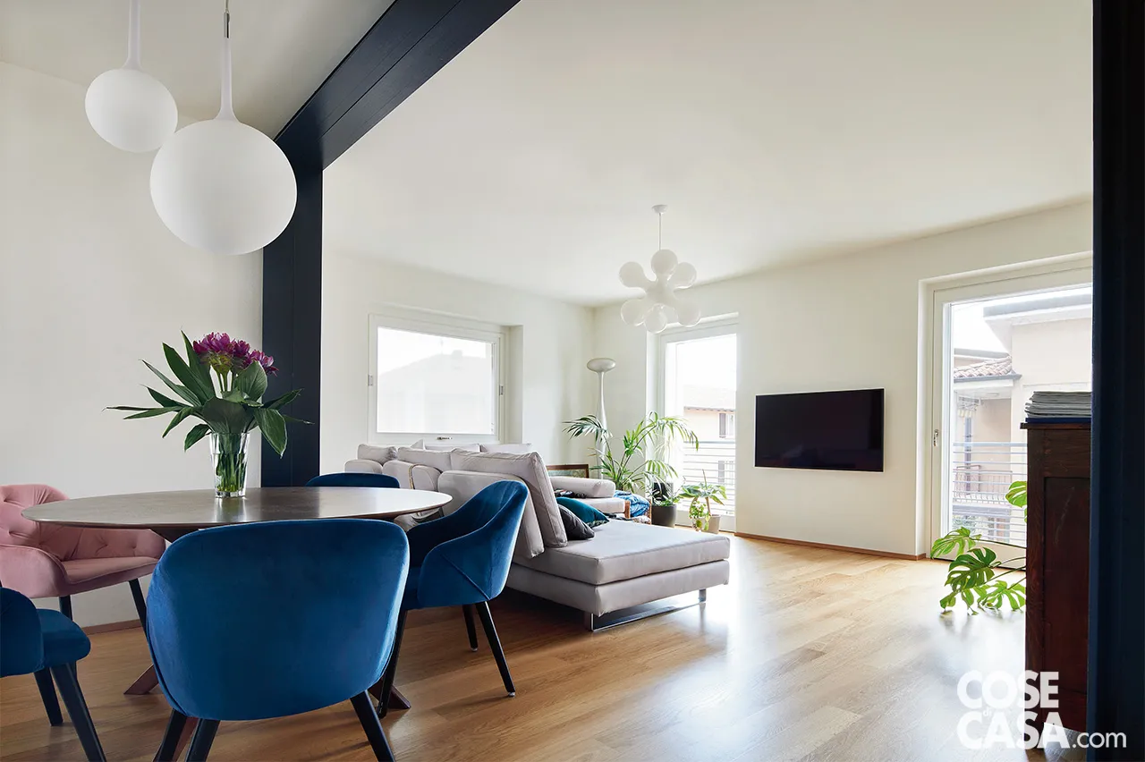 Nella zona conversazione, il lampadario Atomium di Kundalini (kdln.it); nell’angolo, da terra, la lampada E.T.A. sempre di Kundalini; le sospensioni sul tavolo sono Castore di Artemide (www.artemide.com). Il parquet in rovere termotrattato è di Unikolegno (www.unikolegno.it).